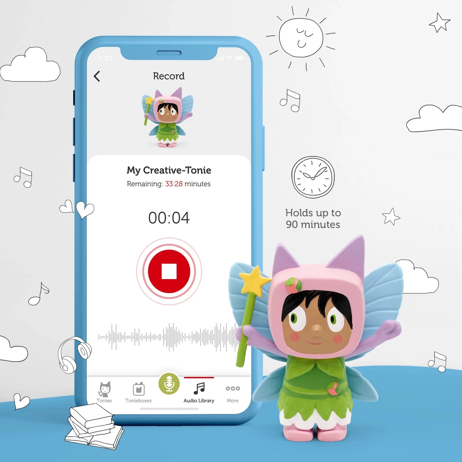 This cute, recordable, fairy Creative-Tonie will work its magic on your Toniebox! Creative-Tonies are hand-painted, magnetic figures with up to 90 minutes of personalized audio content! Parents or Grandparents can add recorded messages, stories and songs so little ones can stay connected to them wherever they are in the world. Whether it is an enchanting bedtime story or your own magical adventure – just upload your audio files using the Tonie-App or the Tonie website with your computer, tablet or smartphone for individualized content to play on your Toniebox. So easy, even the youngest child can operate it. And don’t worry, once the stories have finished, the Toniebox will automatically turn itself off.