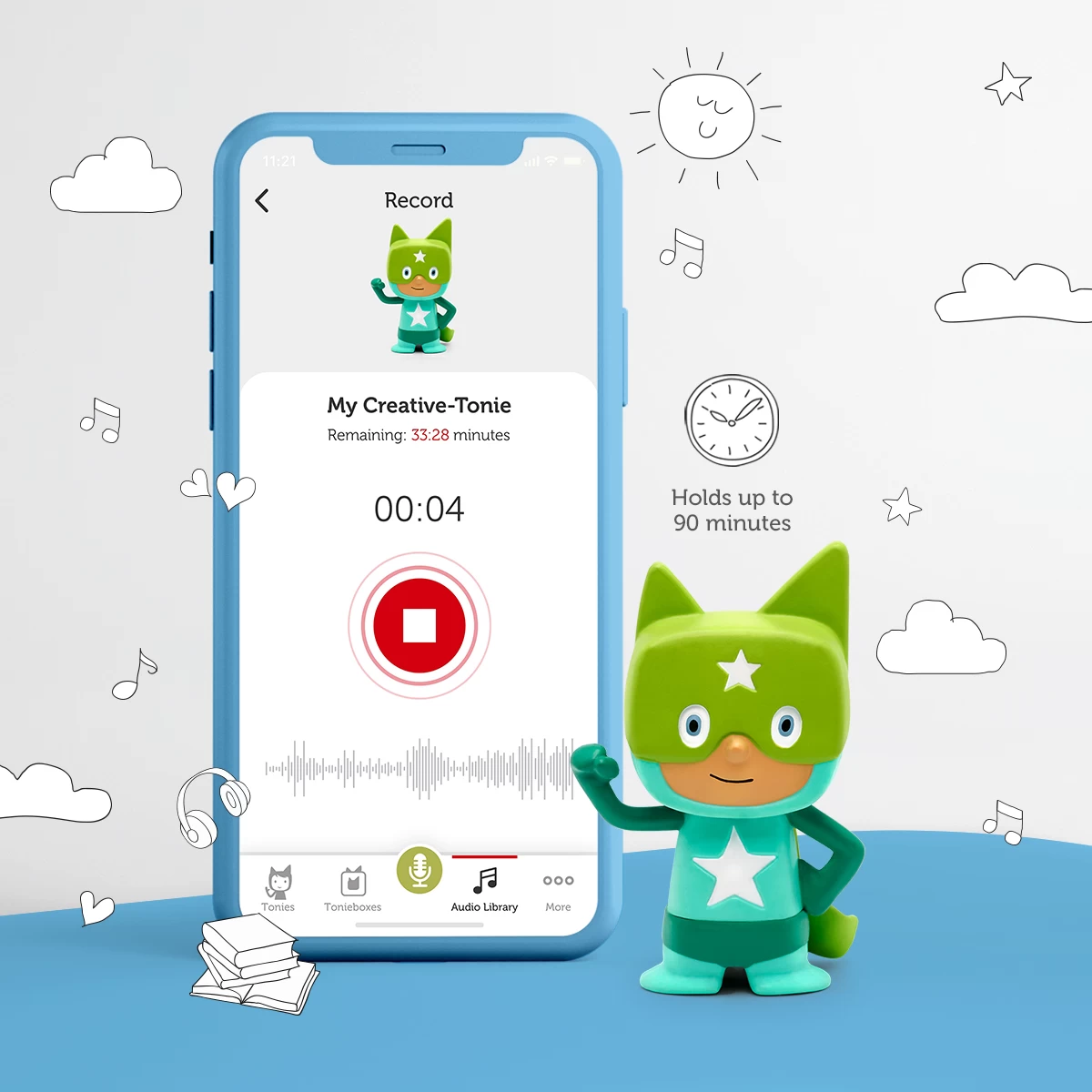 This cute, recordable, superhero Creative-Tonie will work its magic on your Toniebox! Creative-Tonies are hand-painted, magnetic figures with up to 90 minutes of personalized audio content! Parents or Grandparents can add recorded messages, stories and songs so little ones can stay connected to them wherever they are in the world. Whether it is an enchanting bedtime story or your own magical adventure – just upload your audio files using the Tonie-App or the Tonie website with your computer, tablet or smartphone for individualized content to play on your Toniebox. So easy, even the youngest child can operate it. And don’t worry, once the stories have finished, the Toniebox will automatically turn itself off.