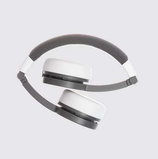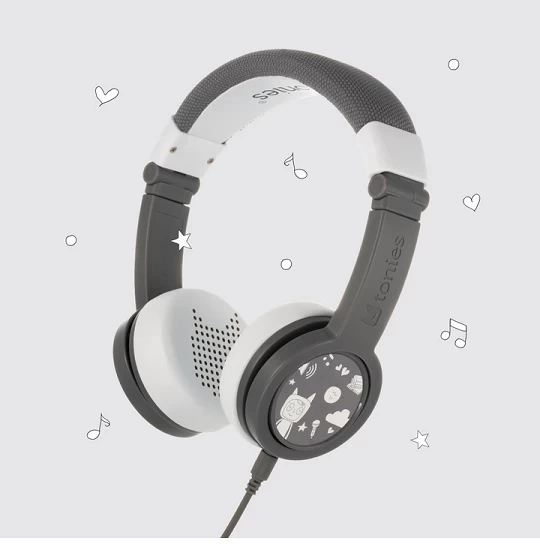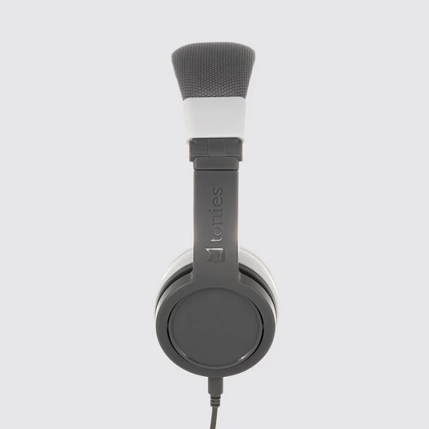 Grey Tonies Headphones! These foldable, durable, kid-safe, volume-limiting headphones come in colors to match your Toniebox. Each headphone set includes a matching sticker set and a detachable audio cable with a BuddyJack splitter for sharing storytime with up to four sets of headphones from a single Toniebox.