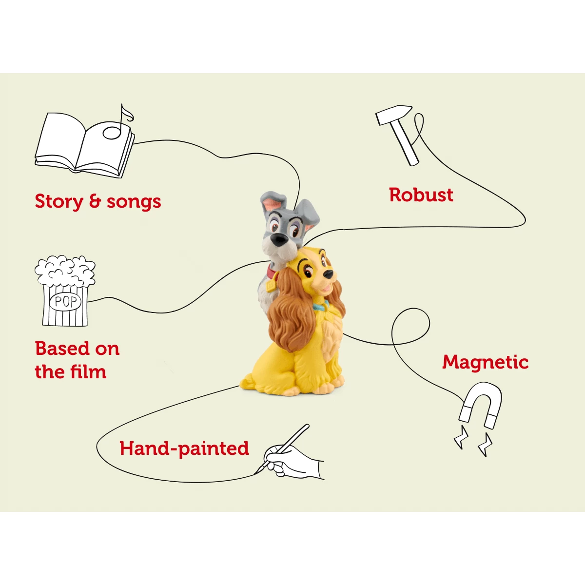 A classic Disney story about a pair of lovable dogs from different sides of the tracks. Lady and the Tramp is a heartwarming tale that has captivated generations of viewers. Now, you can experience the magic of this timeless story in a whole new way with the Tonies Disney – Lady and The Tramp.