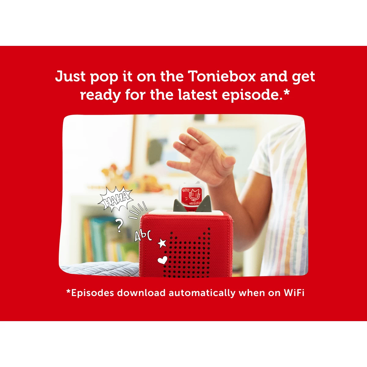 Listeners just pop the Tonie on the Toniebox and a new daily episode will automatically download as long as the Toniebox is within range of WiFi. If you miss a few days or are out of WiFi just pop the Tonie back on the Toniebox when you’re back in range of WiFi and all available episodes, including the latest one, will load.