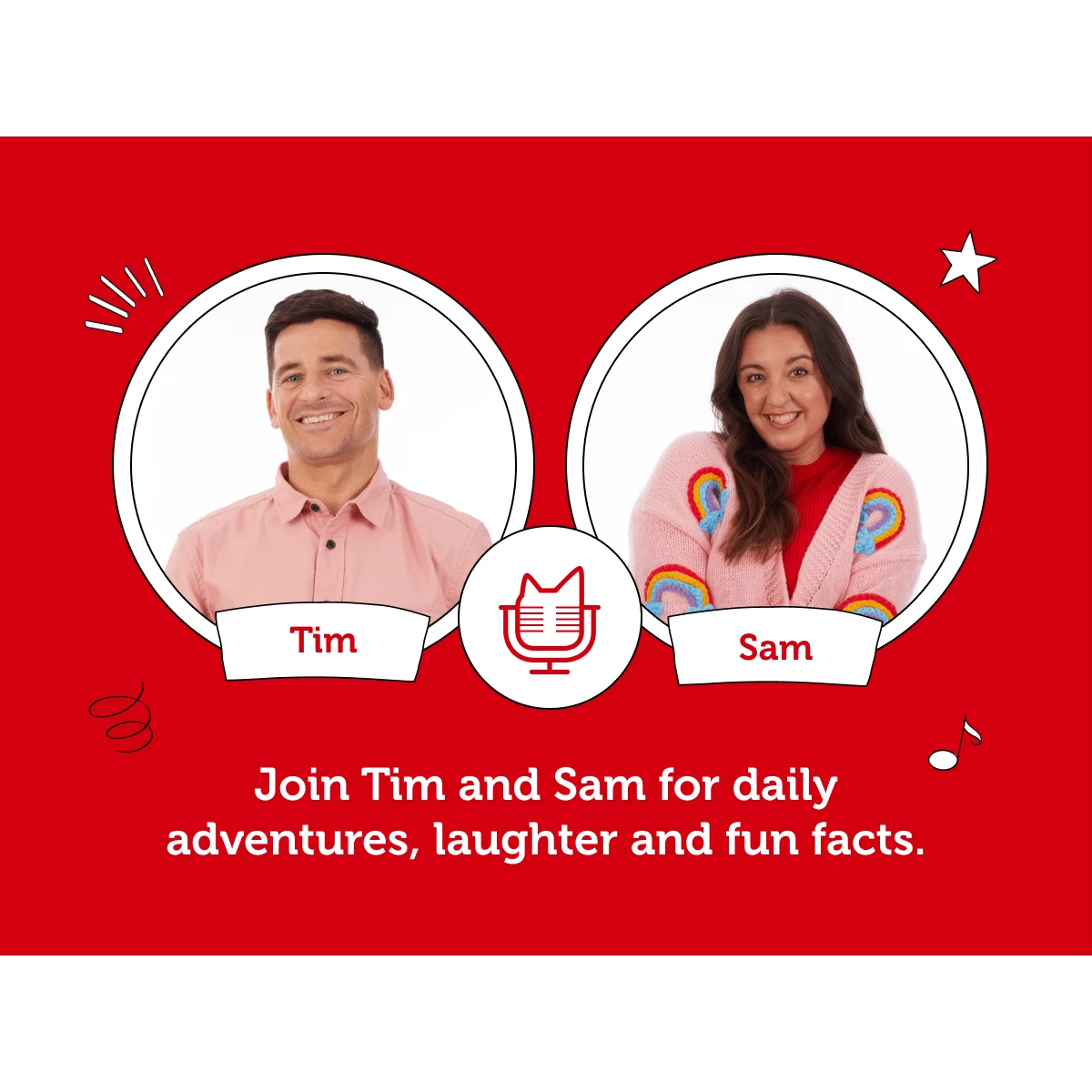 Introducing the Today with tonies Podcast Tonie, a daily 10 minute podcast style show packed full of challenges, fun, facts and jokes. Join our brilliant presenters Sam and Tim as they leap into the Big Bubbling Bucket of Challenges to learn new words, visit new places, dance off some early-morning energy, giggle at hilarious jokes and discover a mind-boggling fact or two (or three!). But that’s not all – listeners will also have the opportunity to send in their own voice notes and be featured on the show!